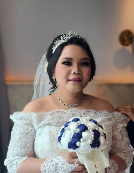 Tata Rias & Tatanan Rambutbridal–party look dengan nuansa dramatis dan mewah. Base makeup: Foundation full coverage, hasil matte–flawless sehingga kulit tampak sangat halus dan cerah. Contour dan highlight cukup tegas untuk membentuk wajah. Alis: Bold dan on point, dibentuk tegas dengan lengkungan jelas, khas rias acara besar. Mata: Eyeshadow smokey bernuansa gelap (hitam–abu/cokelat tua) Eyeliner tebal dan tajam Bulu mata palsu sangat tebal dan panjang, memberi efek mata besar dan dramatis Pipi: Blush pink cerah dengan intensitas cukup kuat agar tetap terlihat di bawah makeup mata yang bold. Bibir: Lipstik pink terang / fuchsia lembut, memberi kesan segar dan feminin. Overall look: Makeup ini cocok untuk pengantin, resepsi, pesta malam, atau busana adat, dipadukan dengan hijab berkilau dan aksesoris kepala, menghasilkan tampilan glamour, elegan, dan fotogenik.